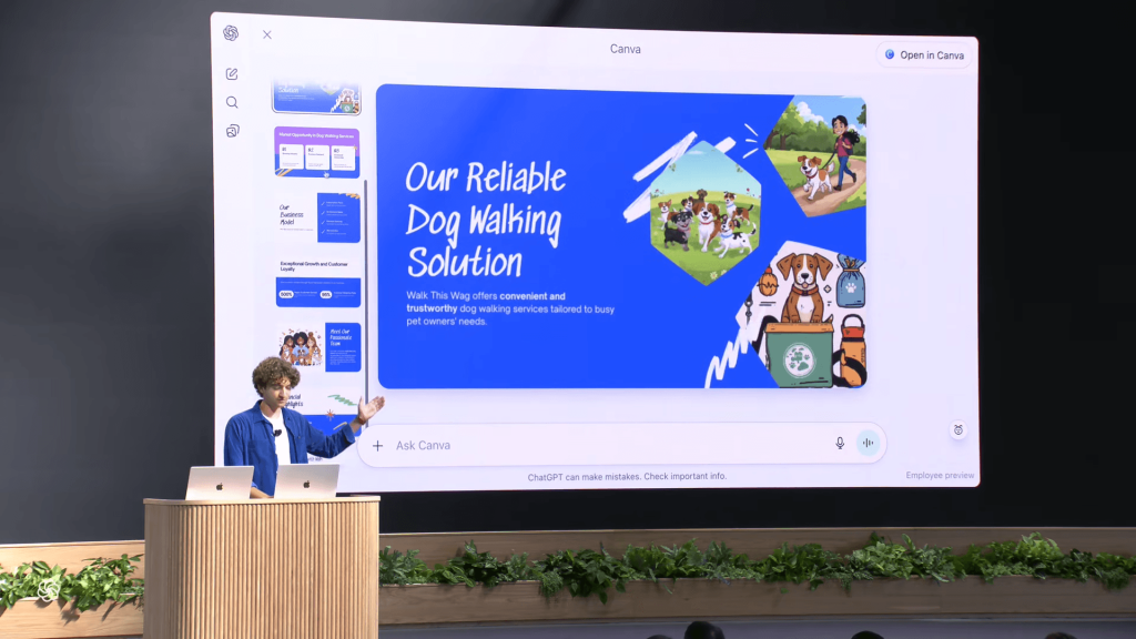 توسعهدهندگان با استفاده از Apps SDK جدید میتوانند اپلیکیشنهایی طراحی کنند که در داخل چت اجرا شوند و با قابلیتهایی مثل نمایش تمامصفحه، ورود به حساب کاربری و پرداخت، تجربهای بهتر برای کاربران فراهم کنند. بهعنوان مثال، در یک دمو، اپلیکیشن Canva پوستری برای یک کسبوکار طراحی کرد و سپس فایل ارائه مرتبط با آن را ساخت.