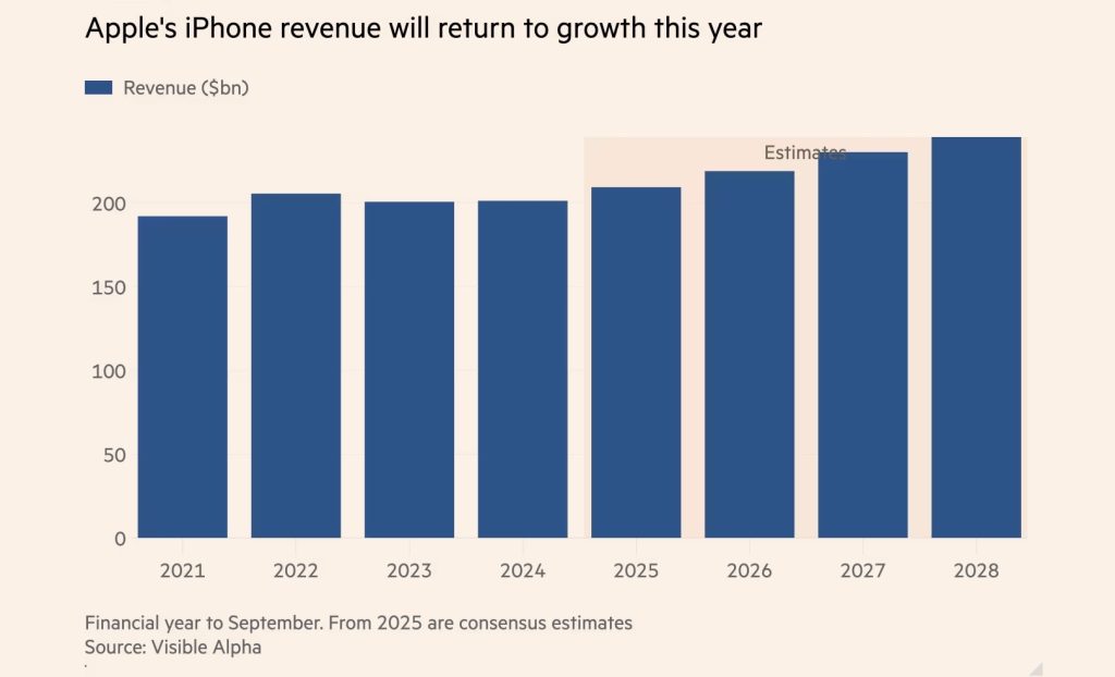 تحلیلگران پیشبینی میکنند درآمد اپل از فروش گوشیهای هوشمند در سال مالی جاری با رشد ۴ درصدی به ۲۰۹.۳ میلیارد دلار برسد. نرخ رشد برای سال مالی ۲۰۲۶ تقریباً ۵ درصد پیشبینی شده و درآمد آیفون به ۲۱۸.۹ میلیارد دلار خواهد رسید.