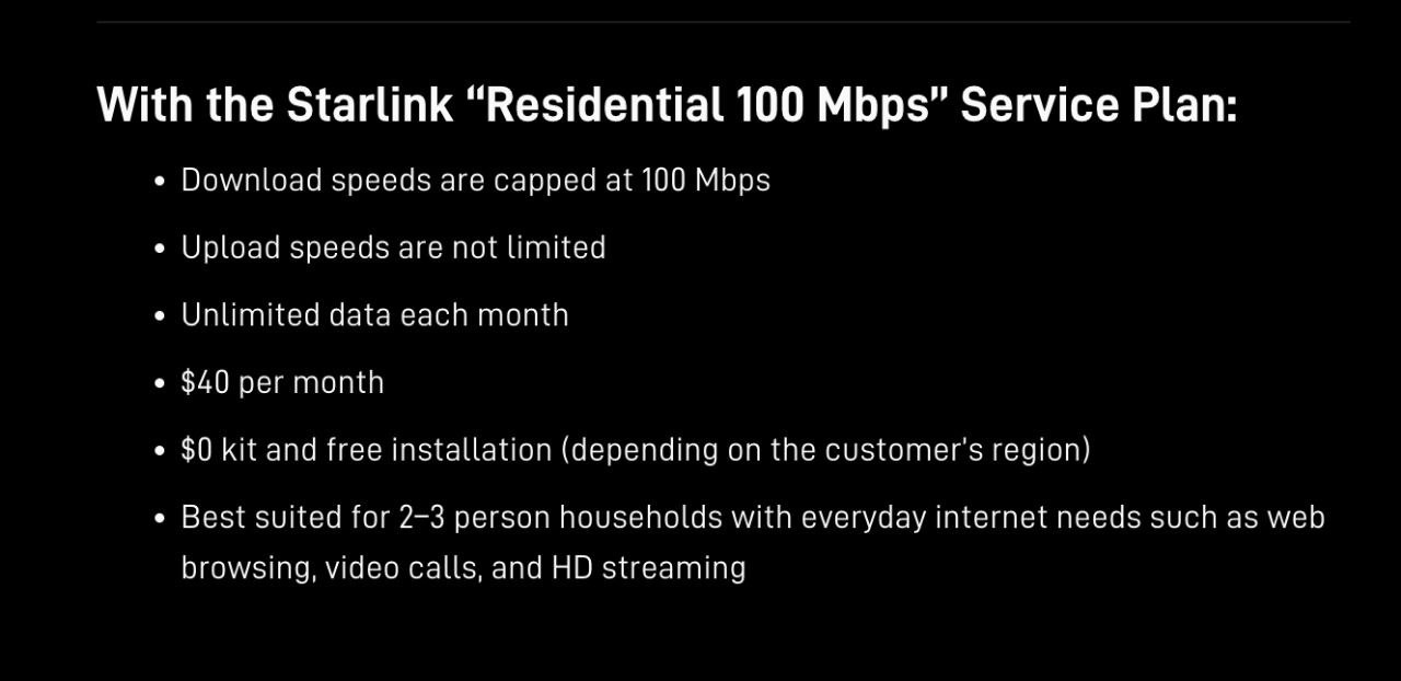 اسپیساکس بیسروصدا ارزانترین طرح استارلینک خود را با نام Residential و با سرعت ۱۰۰مگابیت بر ثانیه و هزینه ماهانه ۴۰ دلار ارائه کرده است. این طرح جدید بهطور قابلتوجهی ارزانتر از طرحهای Residential و Residential Lite است که به ترتیب در آمریکا ماهانه ۱۲۰ و ۸۰ دلار هزینه دارند.