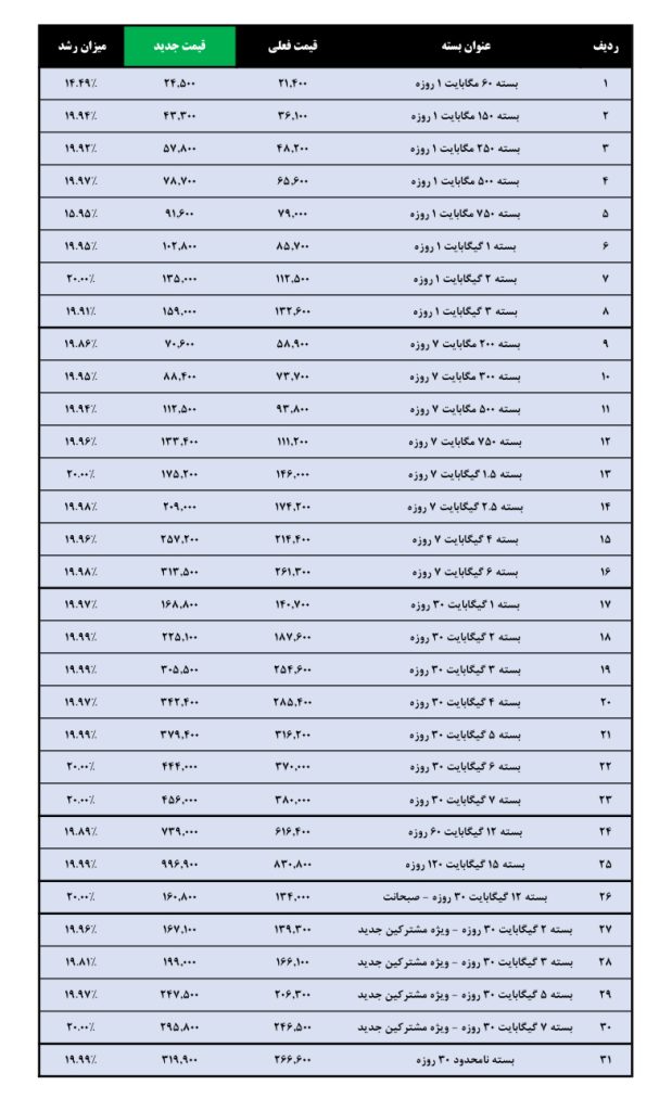همراه اول و ایرانسل اعلام کردند که افزایش ۲۰ درصدی تعرفه بستههای اینترنت این اپراتورها از بامداد سهشنبه، ۱۱ آذر ۱۴۰۴ آغاز شده است. این تغییرات که با موافقت مراجع تصمیمگیر صورت گرفته، در پاسخ به درخواست اپراتورها برای بازنگری در تعرفهها انجام شده است.