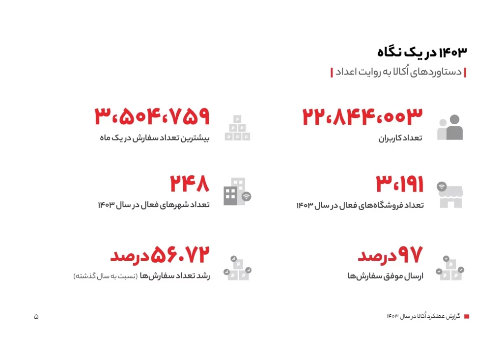 برای اینکه ببینیم این تخمین فروش ناخالص ۱۳۶۵ میلیارد تومانی چقدر درست است، آن را با GMV کل سال اکالا مقایسه میکنیم. آنطور که در صورتهای مالی حسابرسی شده اکالا آمده، سهم این شرکت از هر فروش آنلاین (کارمزد) ۷ درصد است. این شرکت در سال گذشته بیش از ۶۲۱ میلیارد تومان درآمد عملیاتی داشت، بنابراین فروش ناخالص آن (۶۲۱ ضربدر ۱۰۰ تقسیم بر ۷) در سال ۱۴۰۳ حدود ۸۸۷۱ میلیارد تومان بود. بنابراین تخمین ما چندان دور از ذهن نیست.