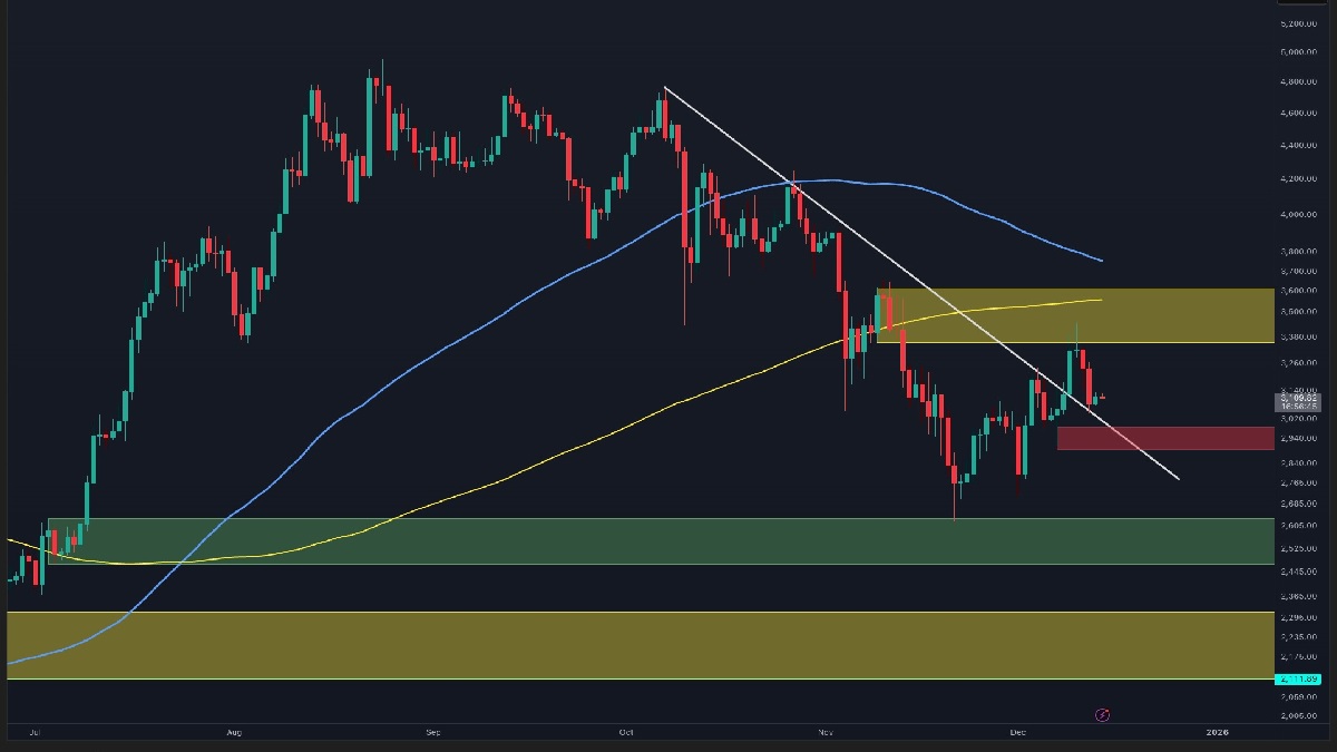 در طول سال ۲۰۲۵، ما شاهد دو شکست کاذب بودیم که هرچند منجر به ثبت سقف تاریخی ۴۹۴۶ دلار شد، اما در نهایت قیمت به داخل کانال بازگشت. اکنون قیمت در میانه این محدوده قرار دارد. تحلیلگران معتقدند که در چنین شرایطی، نزدیک شدن به کف کانال میتواند فرصتی برای بررسی نقاط ورود و خرید اتریوم باشد، چرا که افت اخیر بیشتر بهعنوان چرخش قیمت در داخل کانال دیده میشود تا یک فروپاشی ساختاری.