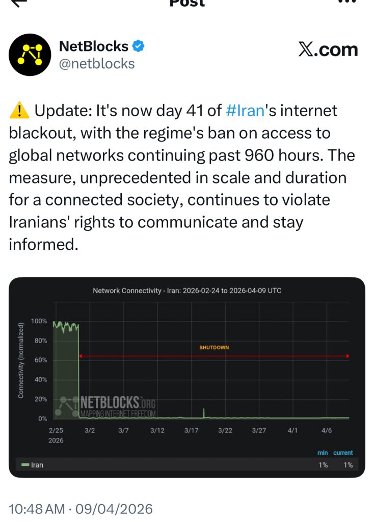 نتبلاکس در پست جدید خود اعلام کرد که ایران وارد چهل و یکمین روز قطعی اینترنت شده و ممنوعیت بر دسترسی به شبکههای جهانی بیش از ۹۶۰ ساعت ادامه دارد.